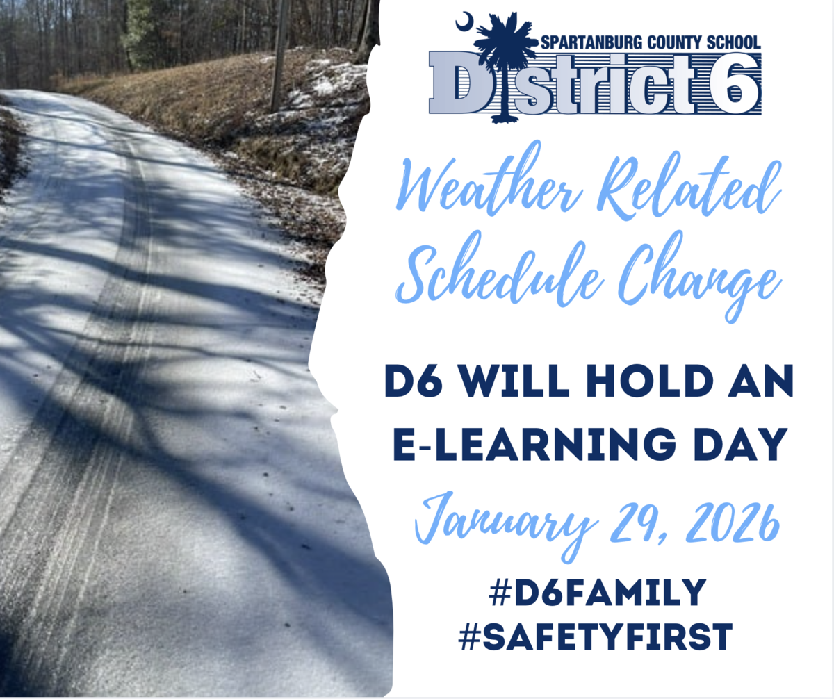 This is not the announcement we hoped to make, but Spartanburg School District Six will hold an E-Learning Day on Thursday, January 29, 2026. While the highways and main roads in our district have improved, many secondary roads are still covered in ice, creating dangerous travel conditions.